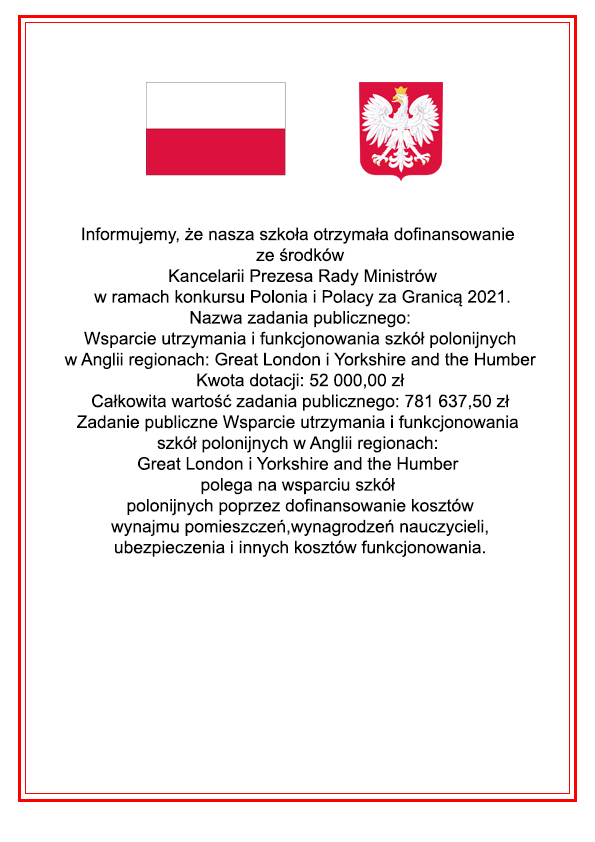 Dofinansowanie otrzymane z Kancelarii Prezesa Rady Ministrów w ramach projektu Biało-czerwone ABC. Wspieranie rozwoju edukacji polskojęzycznej w południowej Wielkiej Brytanii na rok 2022 wynosi 52 800 złotych.