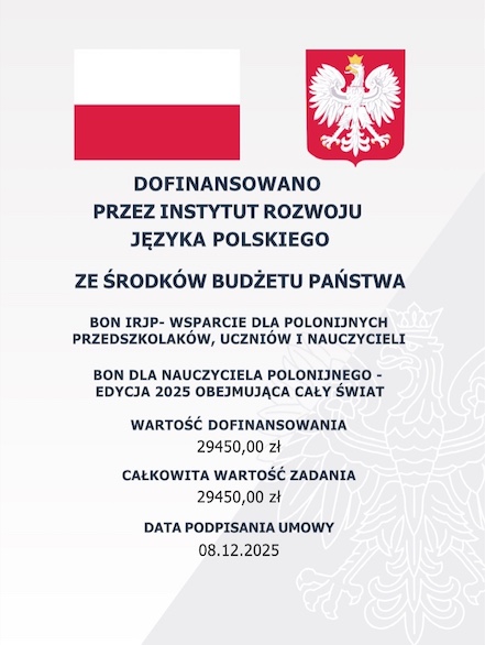 Z przyjemnością informujemy, że nasza szkoła otrzymała dofinansowanie w ramach projektu „Bon dla nauczyciela polonijnego – edycja 2025 obejmująca cały świat”. Projekt jest finansowany przez Instytut Rozwoju Języka Polskiego im. świętego Maksymiliana Marii Kolbego i realizowany przez Fundację „Pomoc Polakom na Wschodzie” im. Jana Olszewskiego.