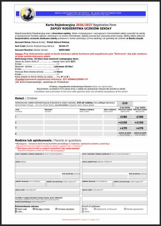 - opłaty za szkołę (uiszczenie opłaty nie gwarantuje miejsca w szkole i opłaty za czesne dla dzieci, które nie otrzymały miejsca, będą zwrócone przed końcem lipca).